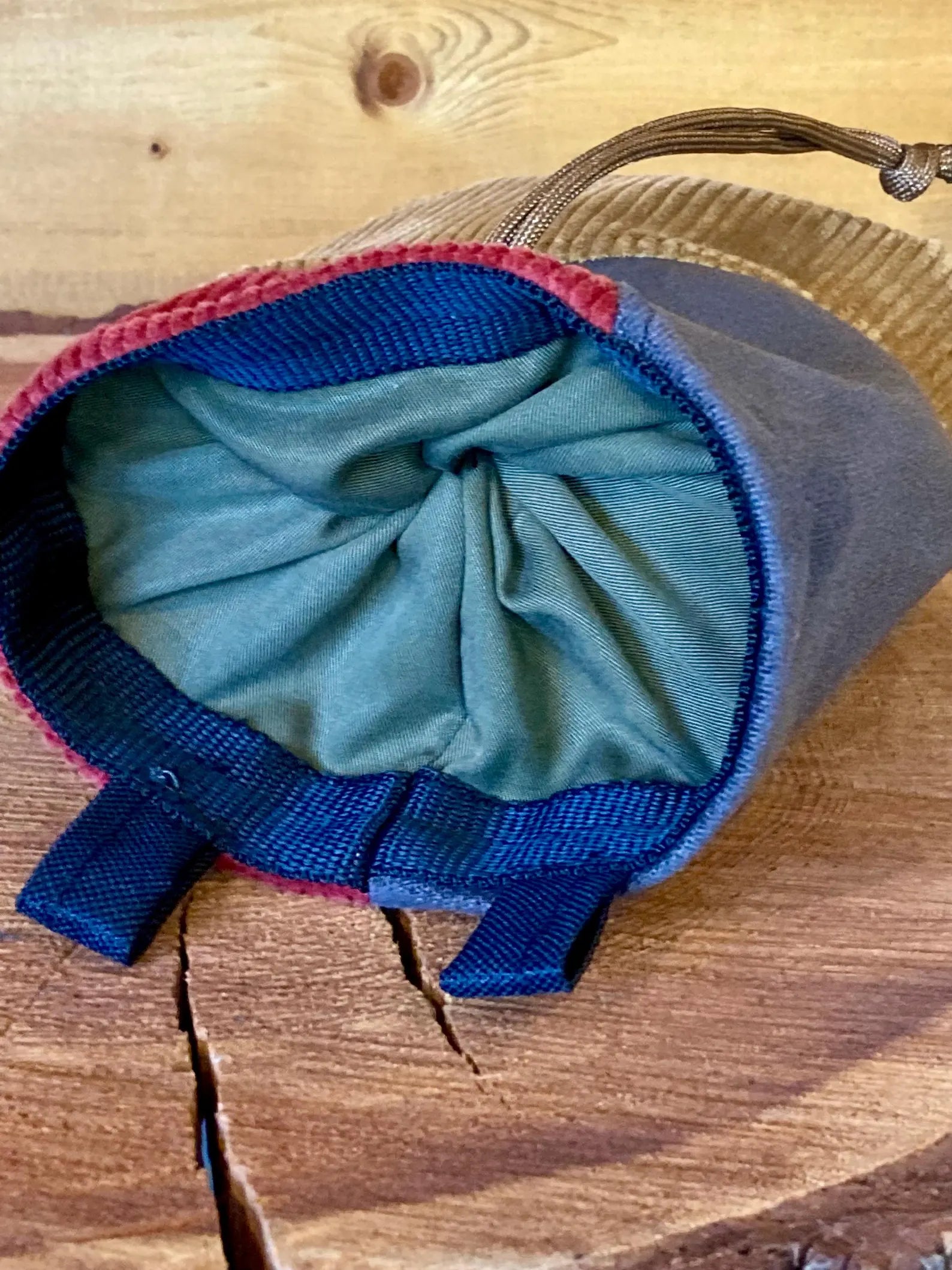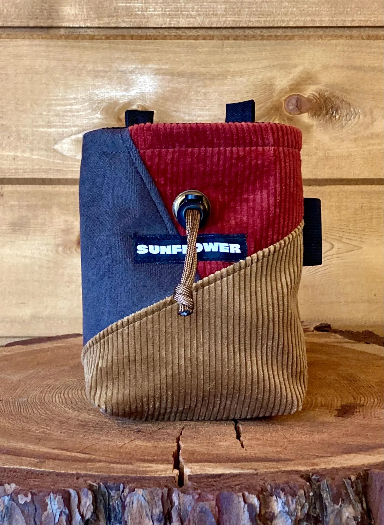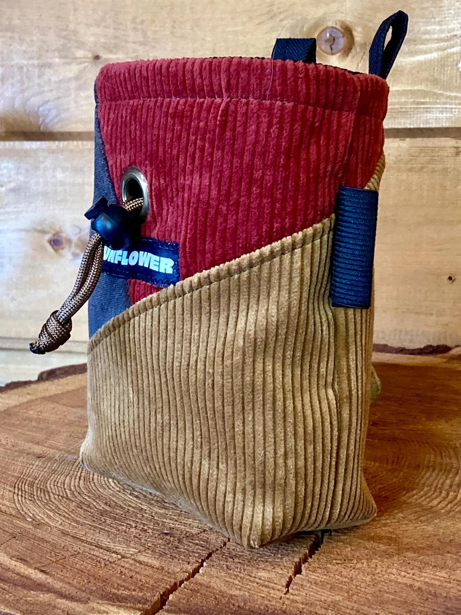 Un pezzo unico, creato a mano con velluto e canvas riciclati, per chi vuole portare un tocco di stile anche in falesia o in palestra.