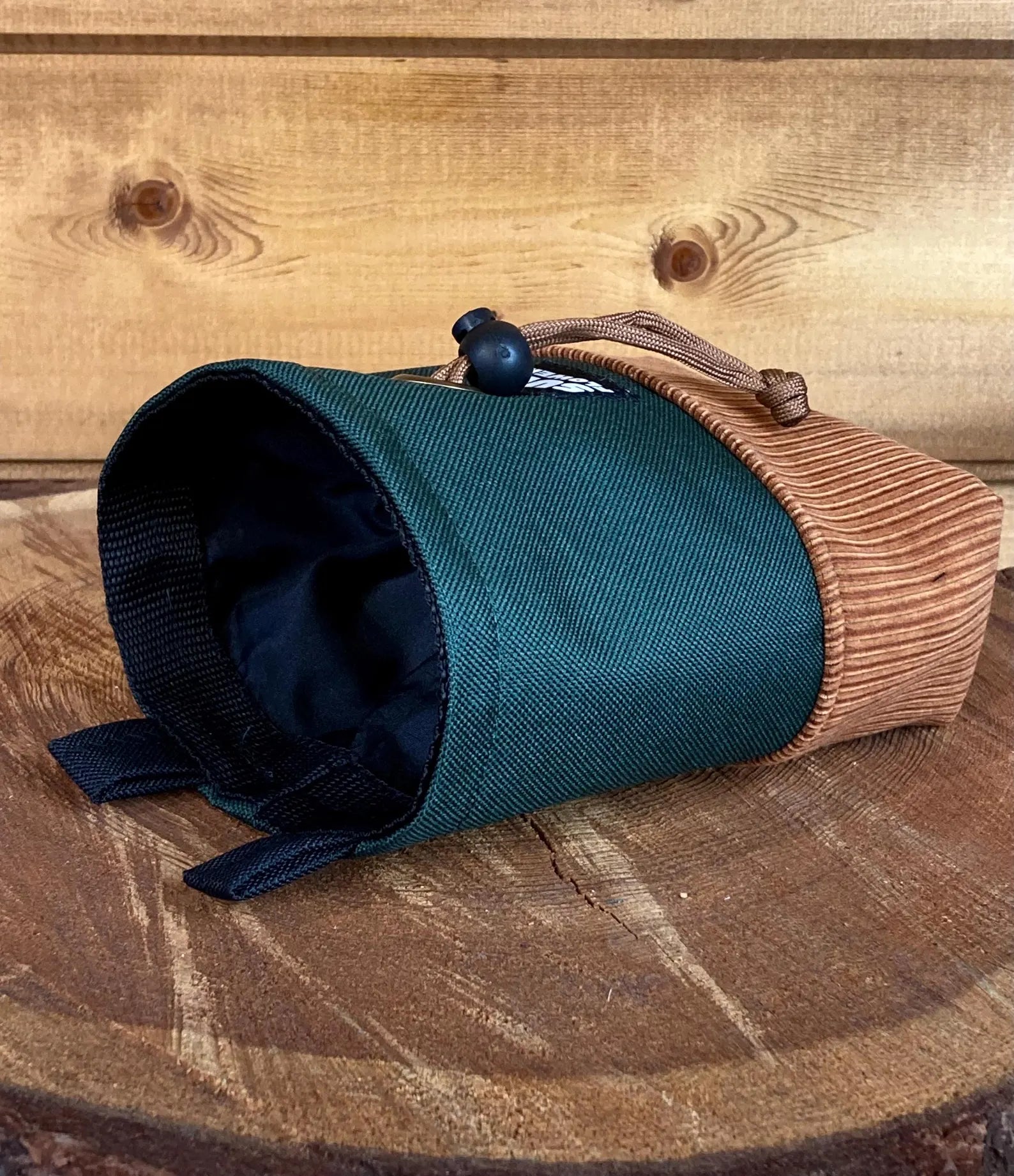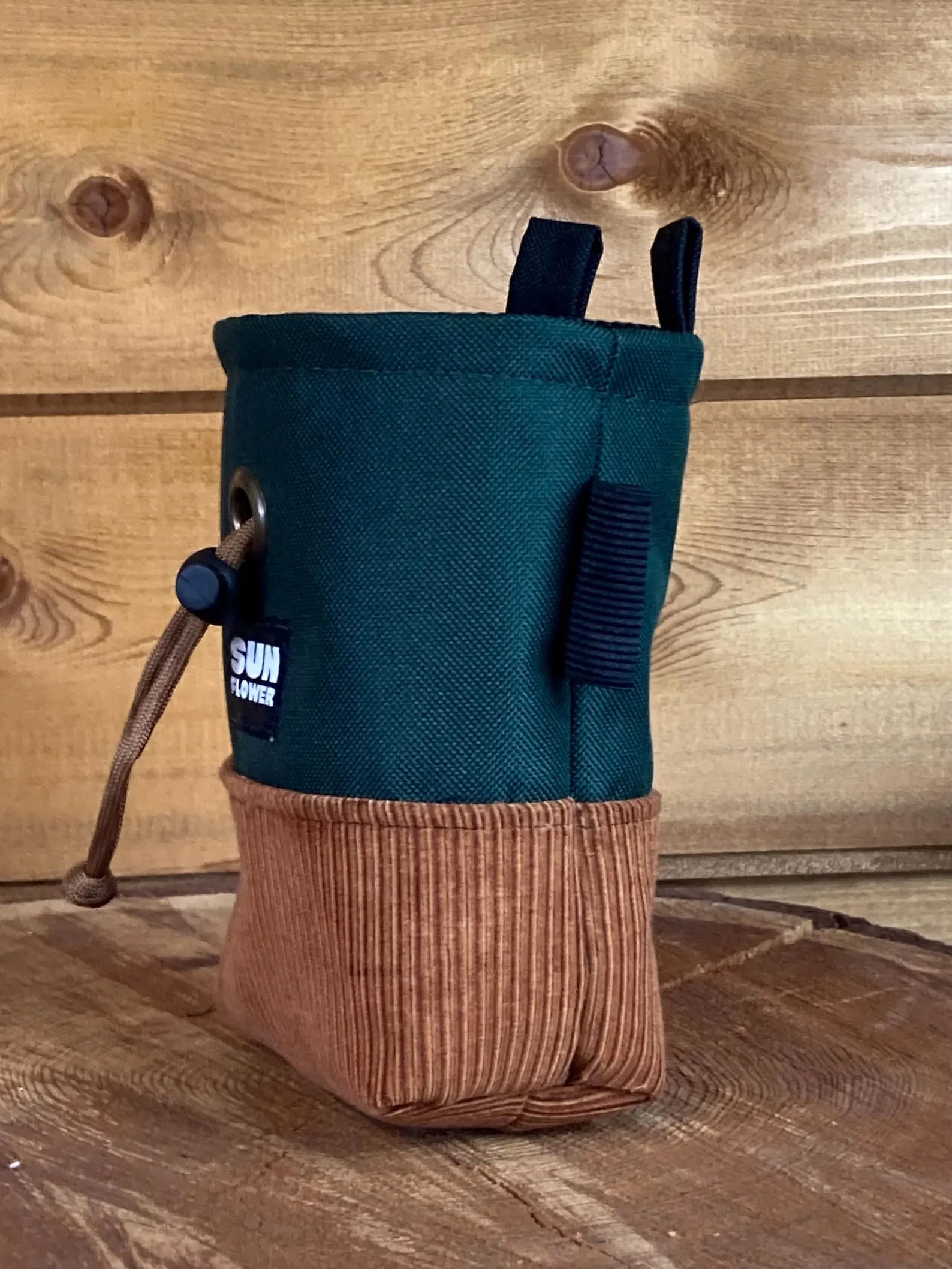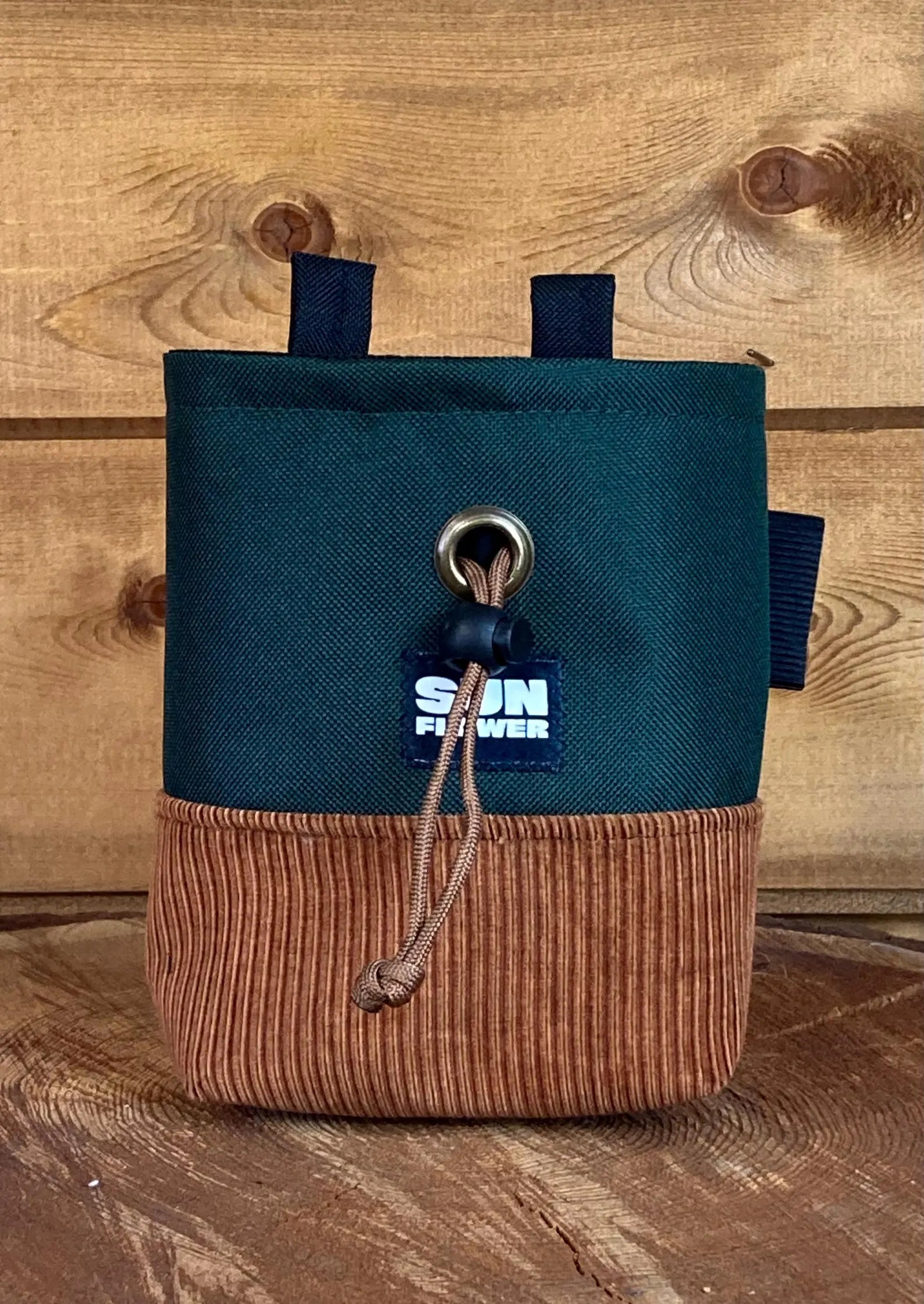 Un pezzo unico, creato a mano con velluto e canvas riciclati, per chi vuole portare un tocco di stile anche in falesia o in palestra.